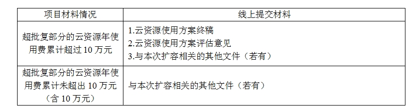 超批复云资源年使用费超10万的,按云资源使用方案评估意见申请扩容;未超10万的,扩容需填写测算依据,提供资源使用情况截图。