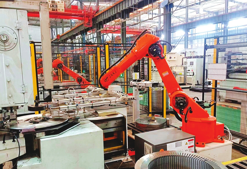 山西电机生产车间内,单冲关节臂机器人使工作效率成倍提升。李志江摄