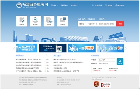 福建政务服务网是在原省网上办事大厅门户的基础上,按照国家政务服务门户建设标准,对门户的徽标、名称、样式等进行重新设计开发建成,新开设了公共服务清单、集成套餐、办件评议等栏目,实现办事服务类和行政监管类政务服务事项融合展示,在“个人用户中心”,新增“我的证照”、“我的公积金”、“我的缴税”、“我的社保”、“我的医保”以及事项办理的智能推荐等功能。福建政务服务网是国家一体化在线政务服务平台对接互联平台,业务覆盖省、市、县、镇、村五级。截止目前,共入驻服务事项14.8万项,95%以上事项可以在线办理,“一趟不用跑”事项2.8万项,“最多跑一趟”事项10.1万项,发布权责清单、前置审批清单和中介服务清单总计81.77万条;累计办结业务947万件,通过福建办事APP、微信等移动端办理业务15万件。