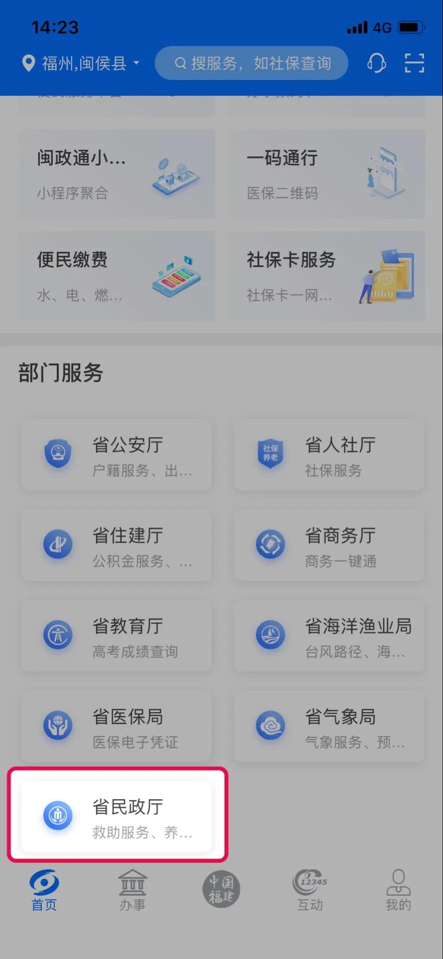 用户实名登录闽政通App,通过首页“部门服务”模块进入“省民政厅”服务页(或首页搜索“民政专区”),即可看到民政专区相关服务。