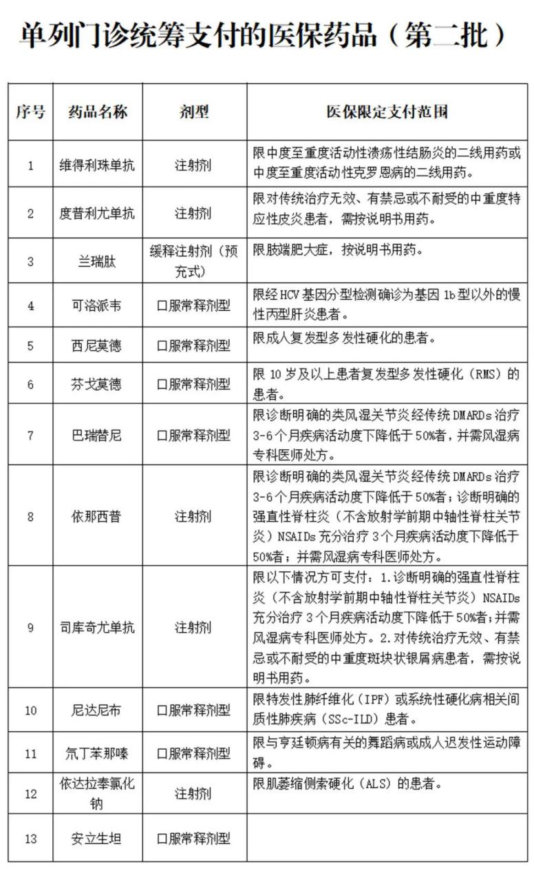 答:适于门诊使用、使用周期较长或规范治疗年度总费用较高、门诊特殊病种未覆盖的治疗性国家医保谈判药品纳入单列门诊统筹支付范围。