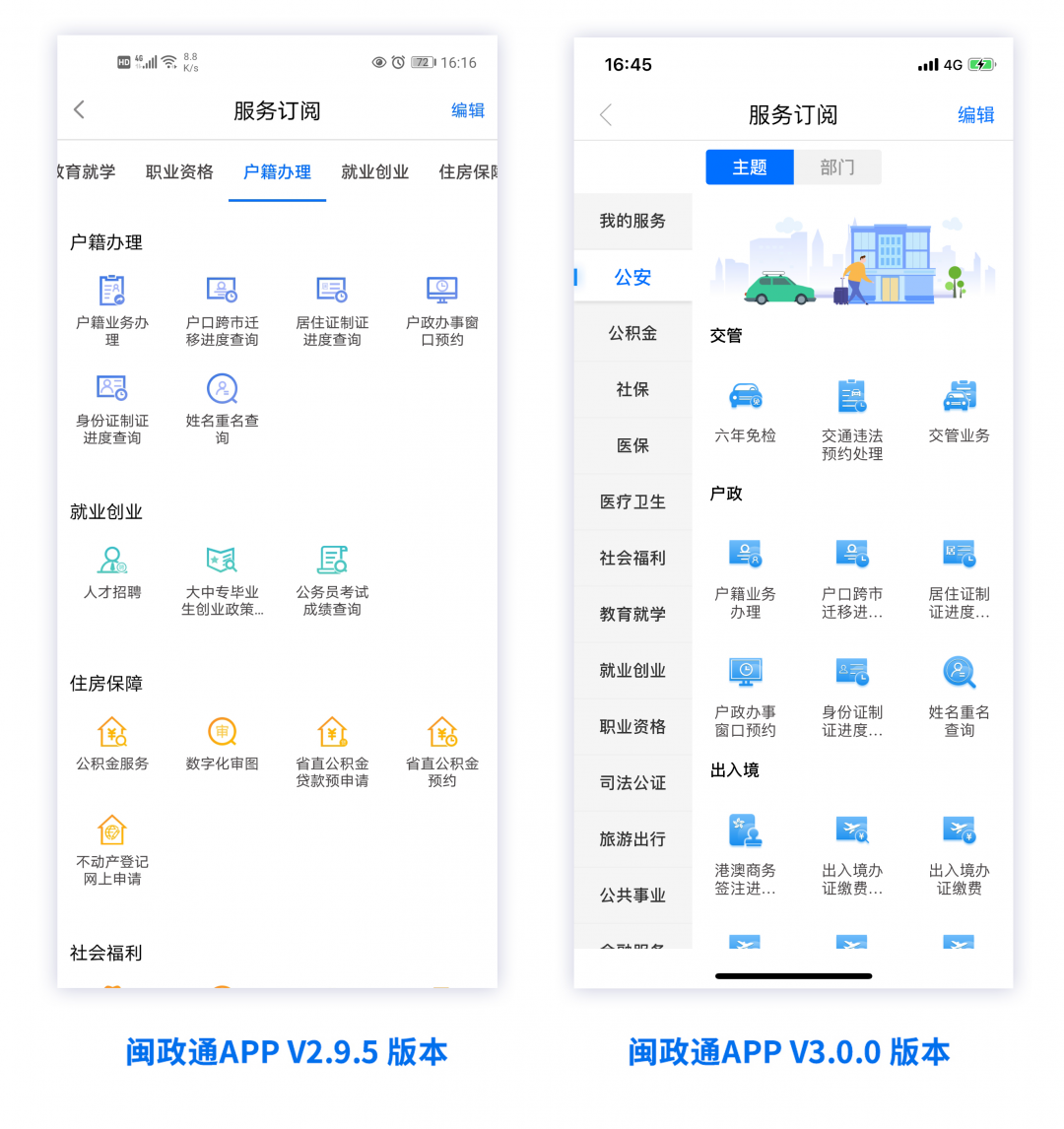 闽政通App3.0版本将现有政务服务重新归纳分类,呈现形式由原先横版专题更改为竖版目录专题,用户可上下滑动查找所需服务。除按分类查找服务外,用户可通过“主题”及“部门”两大模块查找所需服务。