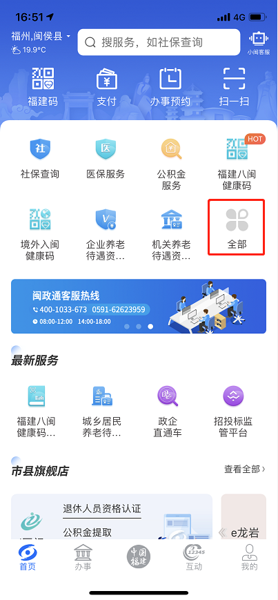 用户实名登录闽政通App,首页点击“全部”。