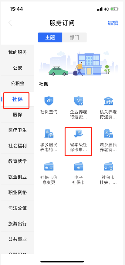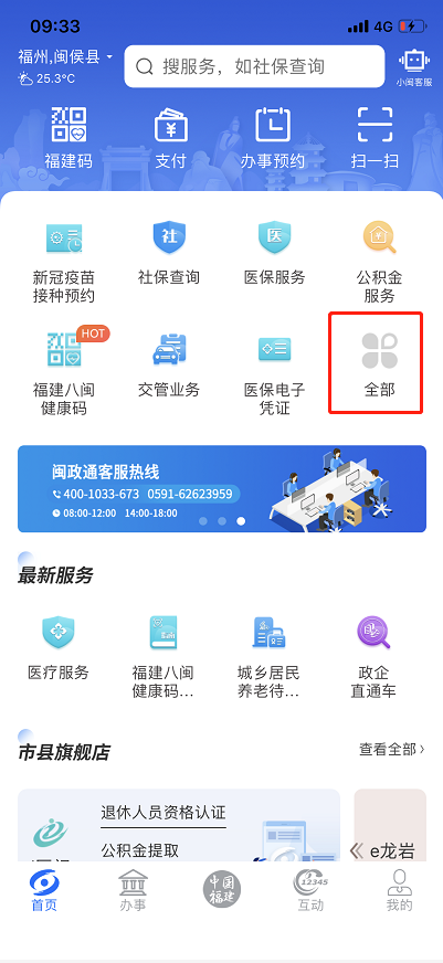 用户实名登录闽政通App,首页点击“全部”,选择“社保”中的“省本级社保卡申领、启用”功能。