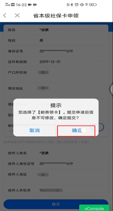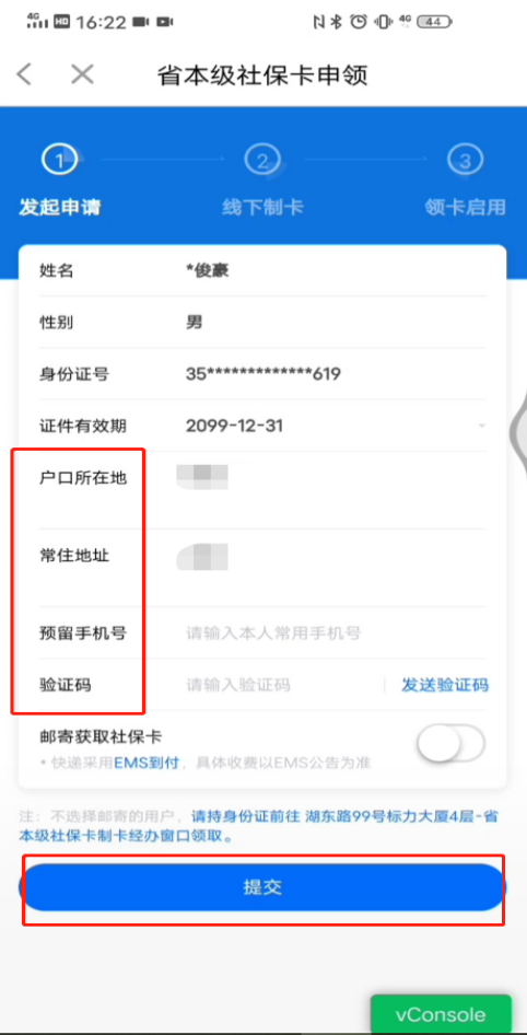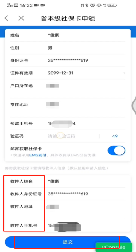 若需邮寄到家,可选择“邮寄获取社保卡”并填写收件地址、手机号等相关信息,然后点击“提交”。