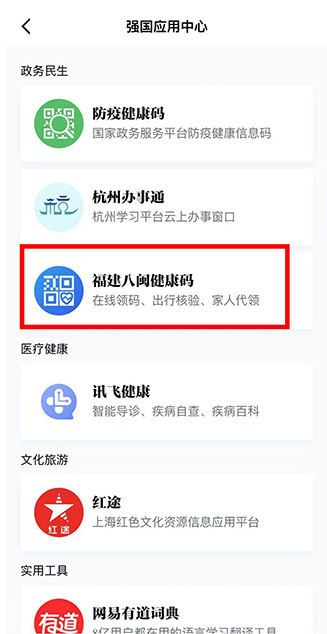 您可以在福建本地频道、福建学习平台和强国应用中心找到“福建八闽健康码”小程序。