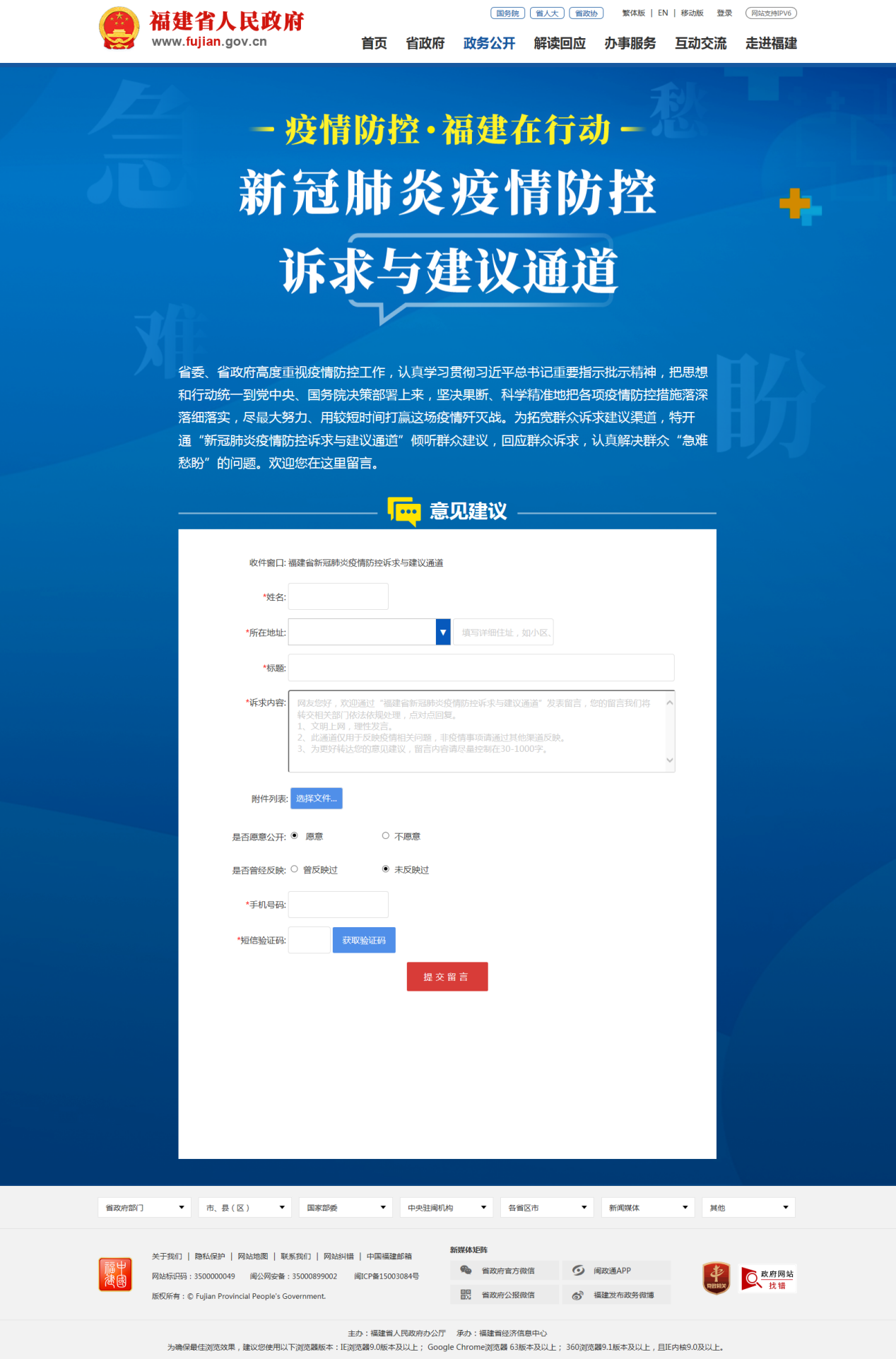 为拓宽群众诉求建议渠道,省新冠肺炎疫情工作领导小组(指挥部)在省政府门户网站首页专设“疫情防控·福建在行动”栏目,并开通了“新冠肺炎疫情防控诉求与建议通道”,倾听群众建议,回应群众诉求,认真解决群众“急难愁盼”的问题。群众意见建议,将在第一时间得到相关部门的回应与解答。