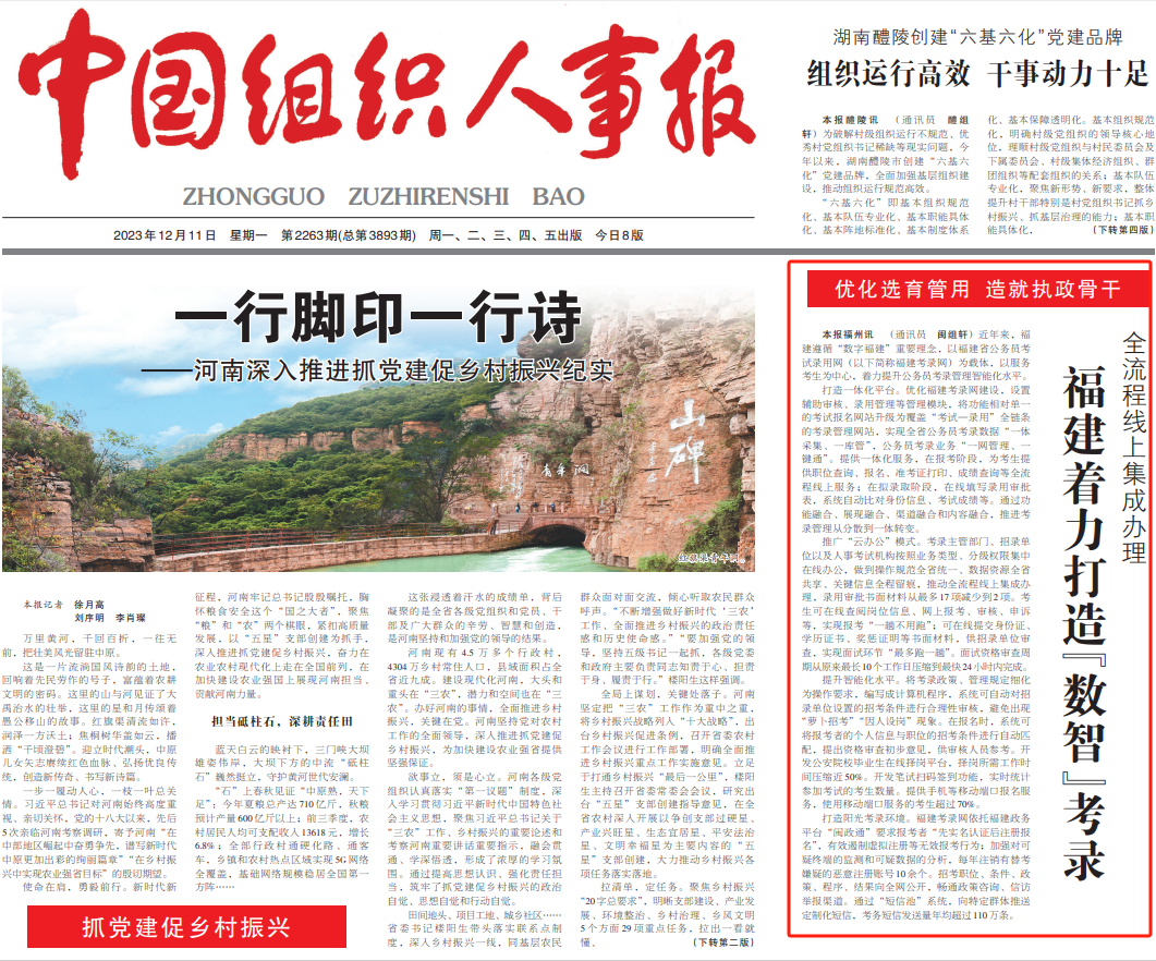 12月11日,《中国组织人事报》头版刊发文章《全流程线上集成办理 福建着力打造“数智”考录》,报道福建遵循“数字福建”重要理念,以福建省公务员考试录用网为载体,以服务考生为中心,围绕打造一体化平台、推广“云办公”模式、提升智能化水平、打造阳光考录环境等四个方面,着力提升公务员考录管理智能化水平。原文刊载如下: