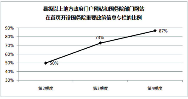2016年第四季度全国政府网站重要政策信息联动发布水平显著提升。县级以上地方政府门户网站和国务院部门网站中,有87%在首页显著位置开设了国务院重要政策信息专栏,78%的网站能够在国务院重要信息发布后24小时内进行转载,比第三季度分别提高14和18个百分点。