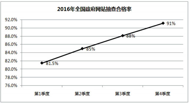 (一)网站合格率显著上升。全国政府网站抽查合格率从第一季度的81.5%提升到第四季度的91%。河北、辽宁、安徽、山东、湖南、四川、陕西、甘肃、新疆、新疆生产建设兵团等地合格率上升显著。北京、广东、青海政府网站年内平均抽查合格率在95%以上,辽宁、上海、江苏、浙江、安徽、海南和宁夏政府网站年内平均抽查合格率在90%以上。