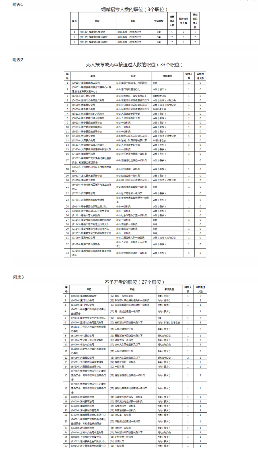 二、33个职位无人报考或无审核通过人数,取消开考,减少录用计划(招考人数)33人(详见附表2)。