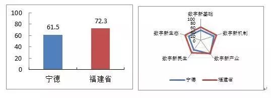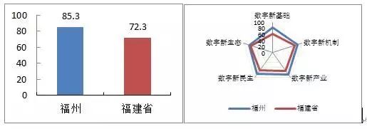 发展特色明显。从五个维度评价结果来看,数字新基础指数评分为62.8分,全省信息基础网络迈入全国一线水平;数字新机制指数评分为75.5分,凸显出我省采用数字化技术推进政府体制机制改革的成效;数字新产业指数评分为73.6分,数字产业化方面物联网、大数据、云计算等快速发展,产业数字化方面工业互联网、智能制造、电子商务等呈现良好发展势头;数字新民生指数的评分为72.7分,医疗、交通、教育等领域得到重点突破;数字新生态指数的评分为75.0分,体现我省生态文明建设成效显著。体制机制创新、数字产业、生态保护是福建省数字经济发展的重要特色。