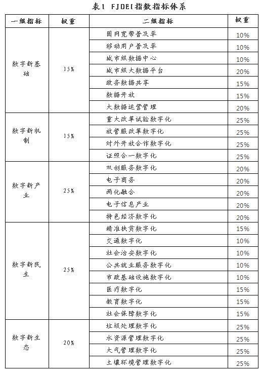 具体而言,FJDEI指数从数字新基础、数字新机制、数字新产业、数字新民生、数字新生态五个维度分指数共计28个指标来衡量我省数字经济发展情况。课题组邀请多位行业专家对各级指标的重要性进行打分,并使用层次分析法计算指标权重。