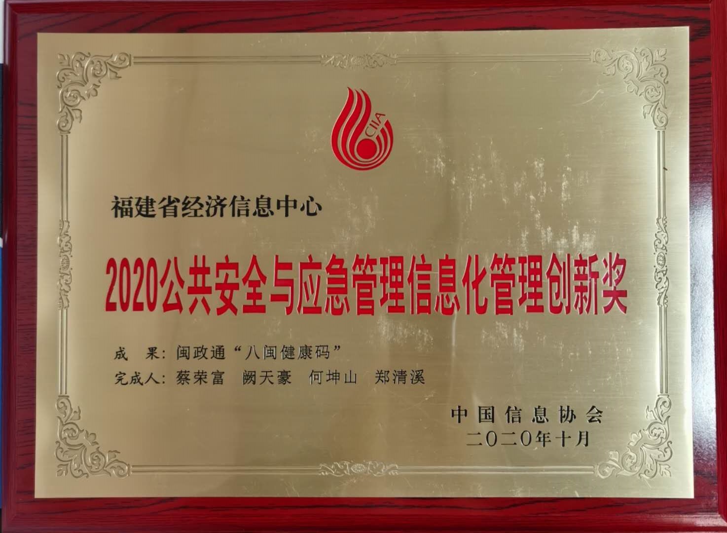 10月23日,2020政府信息化大会在北京召开,福建省经济信息中心负责建设的闽政通“八闽健康码”荣获“2020公共安全与应急管理信息化创新奖”。