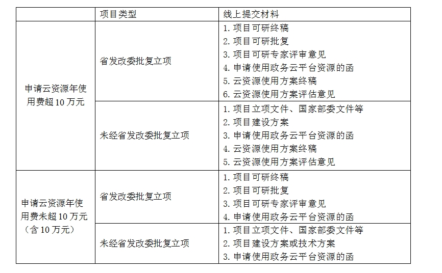 在线上平台填写《福建省电子政务云计算平台IaaS业务登记表》或《福建省电子政务云计算平台物理设备托管业务登记表》(线上平台使用说明:http://file.nebulabd.cn:801/zh.pdf),提交相应材料作为附件,具体详见下方说明。