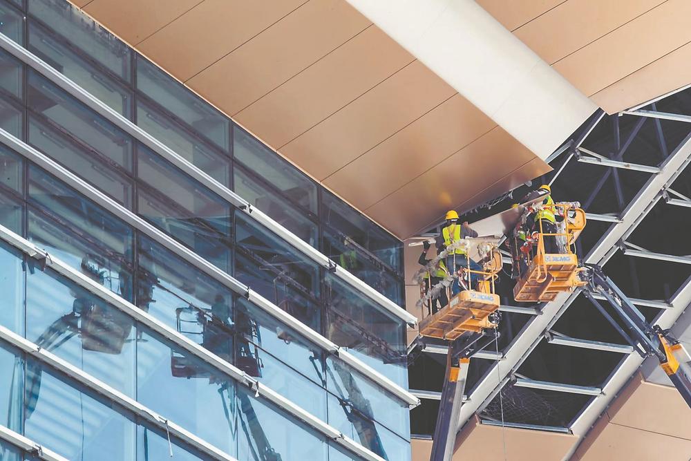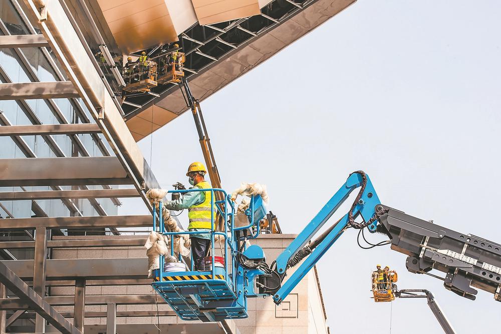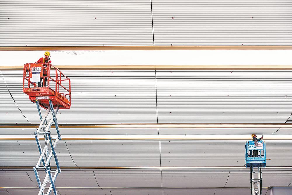11日,在新建甬广高铁福州南站房屋建筑及配套工程现场,工人们坐上云梯,正在紧张地进行内部装饰工程扫尾工作,5月即将进入联调联试阶段。