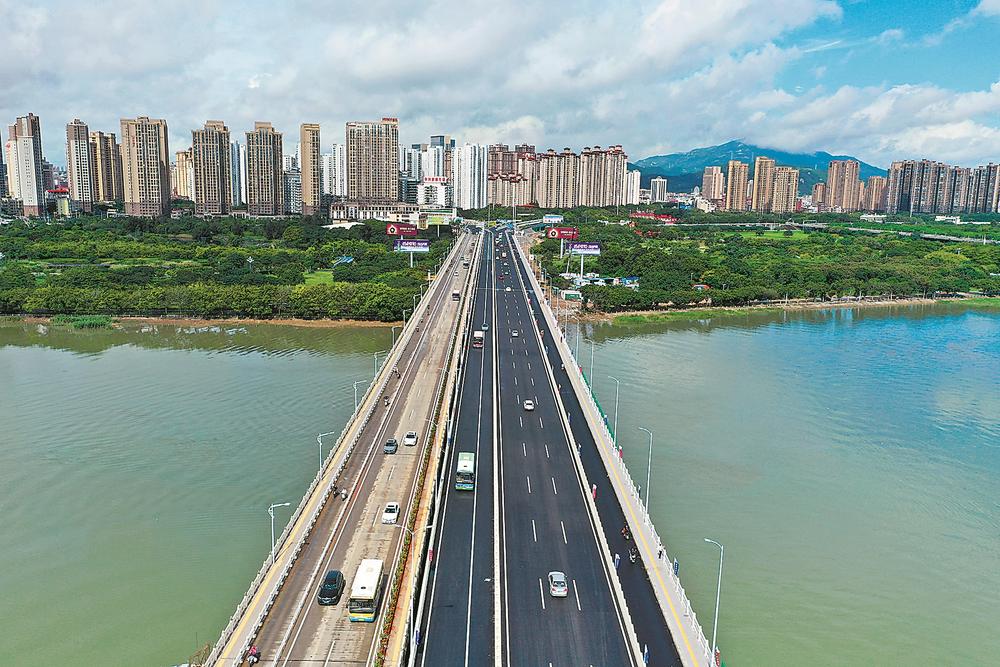 7月1日,国道324线泉州大桥及接线扩宽改造工程提前两个月完工,正式通车。国道324线泉州大桥及接线扩宽改造工程,在既有的泉州大桥旁新建一座26米宽的新桥,与旧桥相拼形成总宽43米的桥梁。这一项目采用二级公路兼城市主干道标准建设,设计时速60公里。大桥由双向2车道变身为双向6车道,大大方便了晋江两岸的车辆人员往返。(记者 李向娟 通讯员 陈起拓 摄)