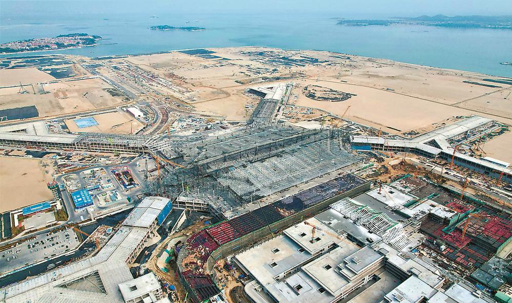 厦门翔安机场航站楼屋盖结构共分上中下三层,由空间及平面桁架和正交正放钢网架结构构成。从外形来看,航站楼主楼屋盖的双坡三层三重檐叠落设计,灵感源自闽南传统大厝,神似振翅欲飞的白鹭。(记者 施辰静 摄影报道)