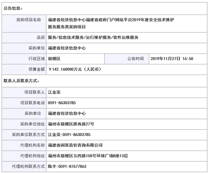 福建省政府门户网站平台2019年度安全技术维护服务服务类采购项目单一来源采购审核前公示