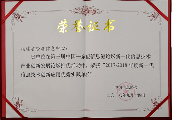 中心荣获“2017-2018年度新一代信息技术创新应用优秀实践单位”