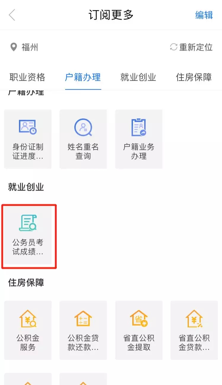在首页热门推荐区域点击“全部”进入服务集合页面,选择”就业创业“专题的”公务员考试成绩查询“服务,根据提示输入身份证号及准考证号即可查询。