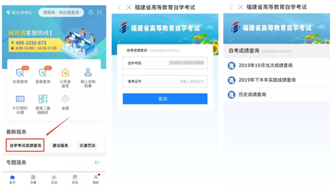 11月19日,闽政通APP上线福建省教育考试院高等教育自学考试成绩查询服务。考生可以通过闽政通APP查询2019年10月当次成绩,2019年下半年实践成绩及历年考试成绩。