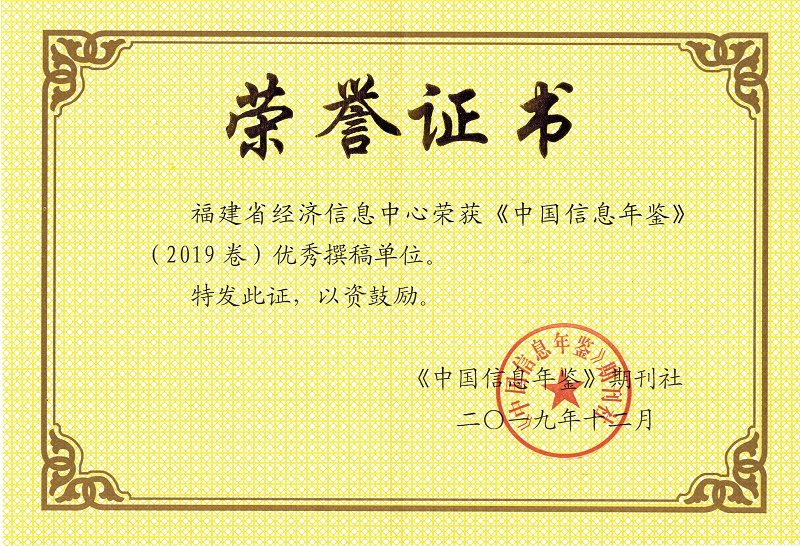 2019年12月,中心被国家信息中心评为“《中国信息年鉴》(2019卷)优秀撰稿单位”,总工室吴钦阳同志被评为“《中国信息年鉴》(2019卷)优秀撰稿人”。